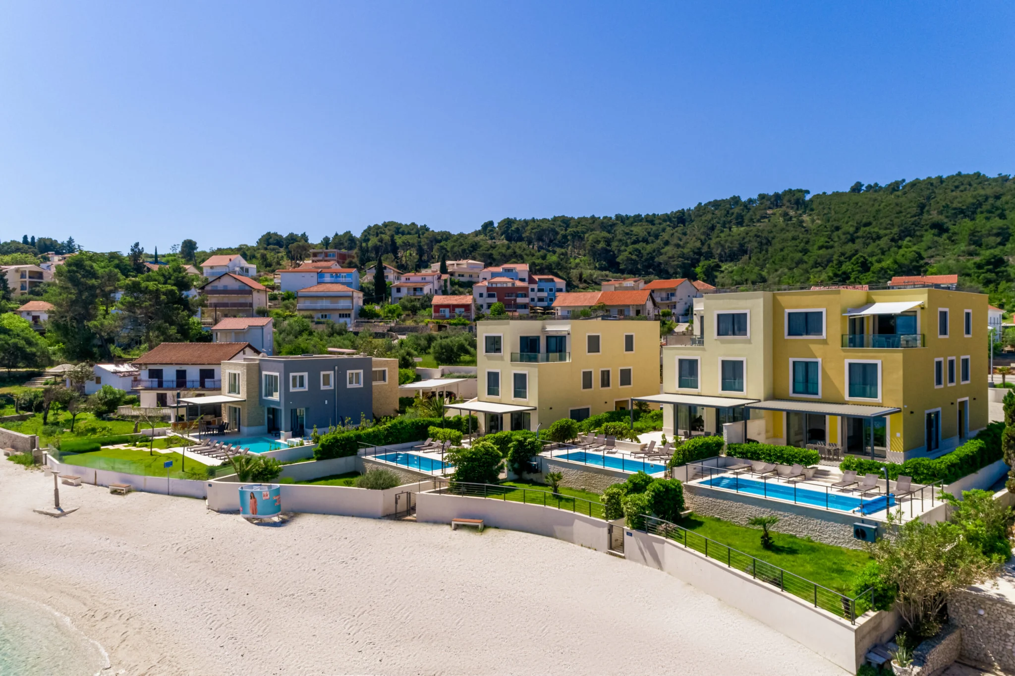 Keine Straße trennt die Villen/Apartments vom kristallklaren Meerruhezone
